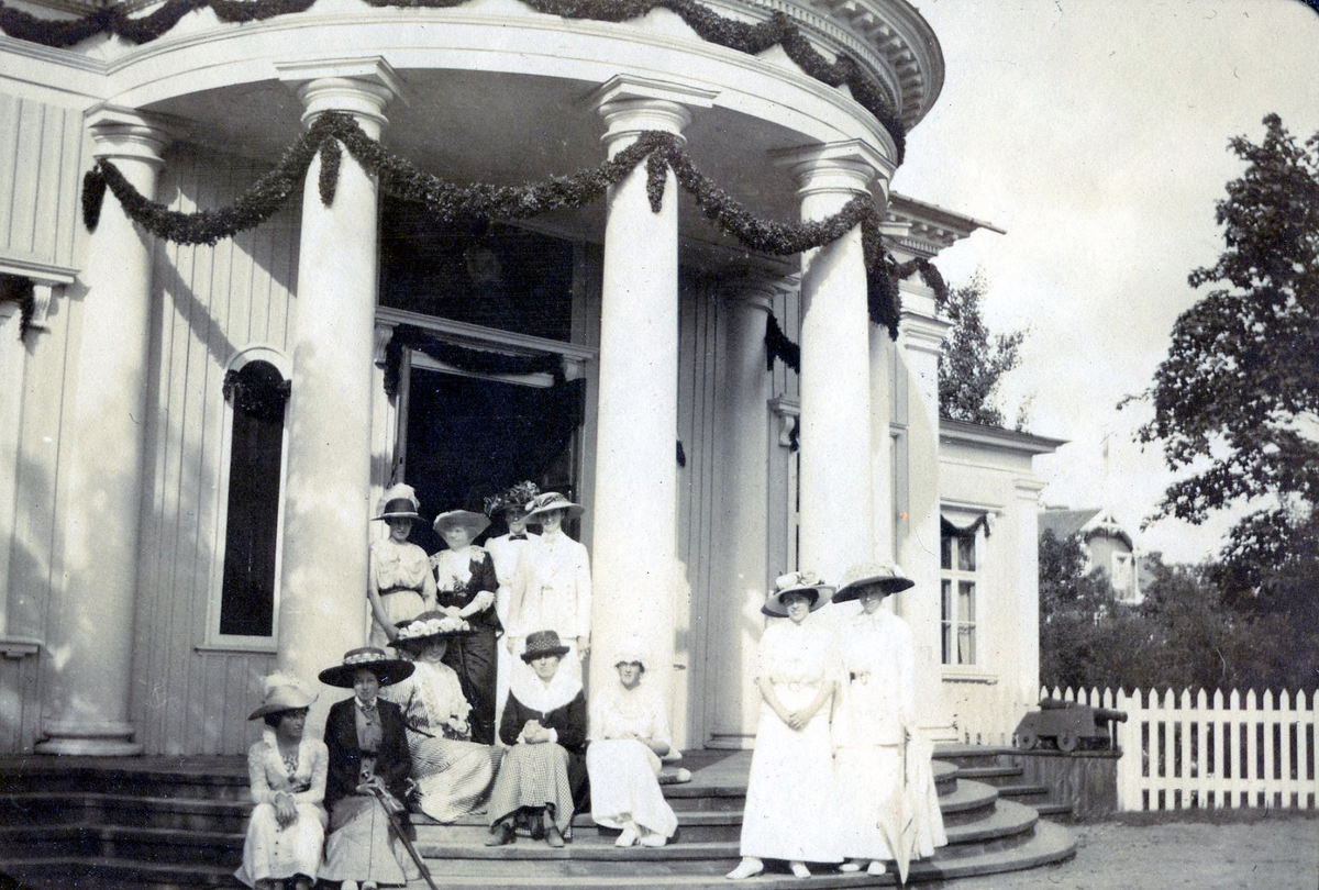 Titel: Officersmässen "Trianon" på Hultsfreds slätt. Damer på verandan. Kalmar regemente.