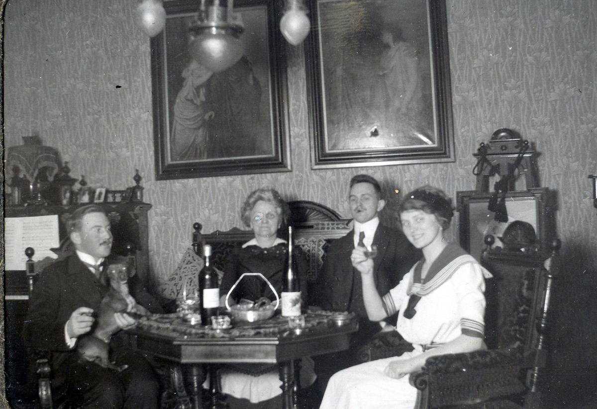 Titel: Civilklädda herrar och damer runt ett rökbord. Vad som förmodligen är cognac och sherry inmundigas.