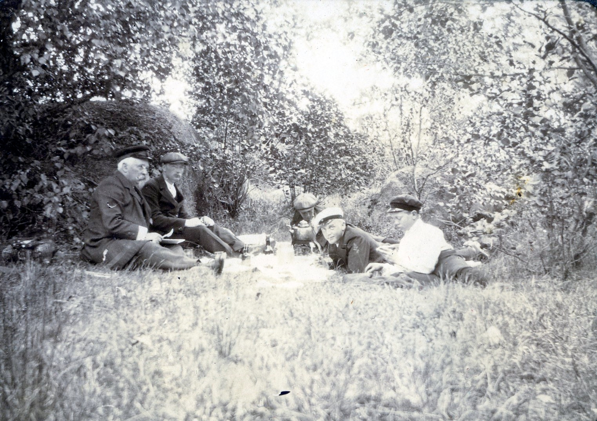 Titel: Oidentifierade civila sitter och ligger på gräset.