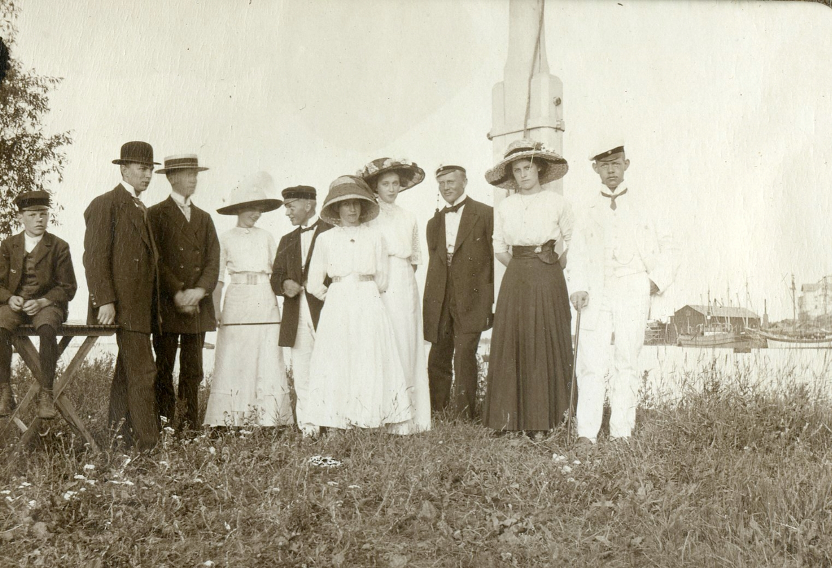 Titel: Finklädda personer vid vatten.