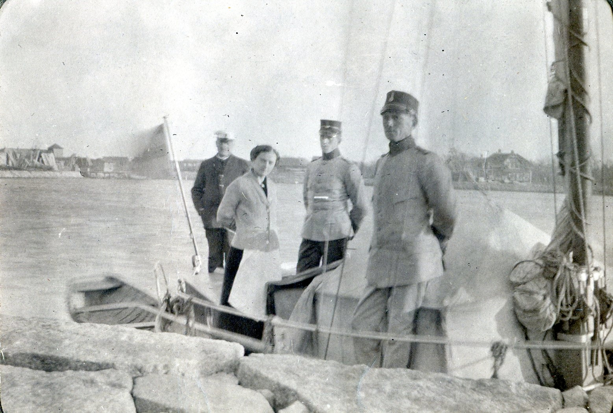 Två oidentifierade officerare i uniform m/1910, en äldre man och en pojke i motorbåt. Kalmar regemente.