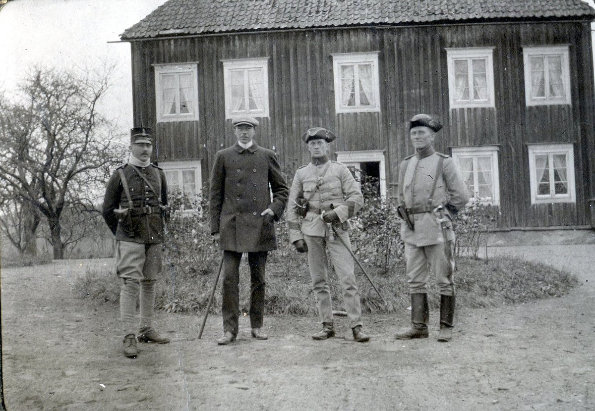 Titel: Oidentifierade officerare framför äldra karaktärsbyggnad. Kalmar regemente.