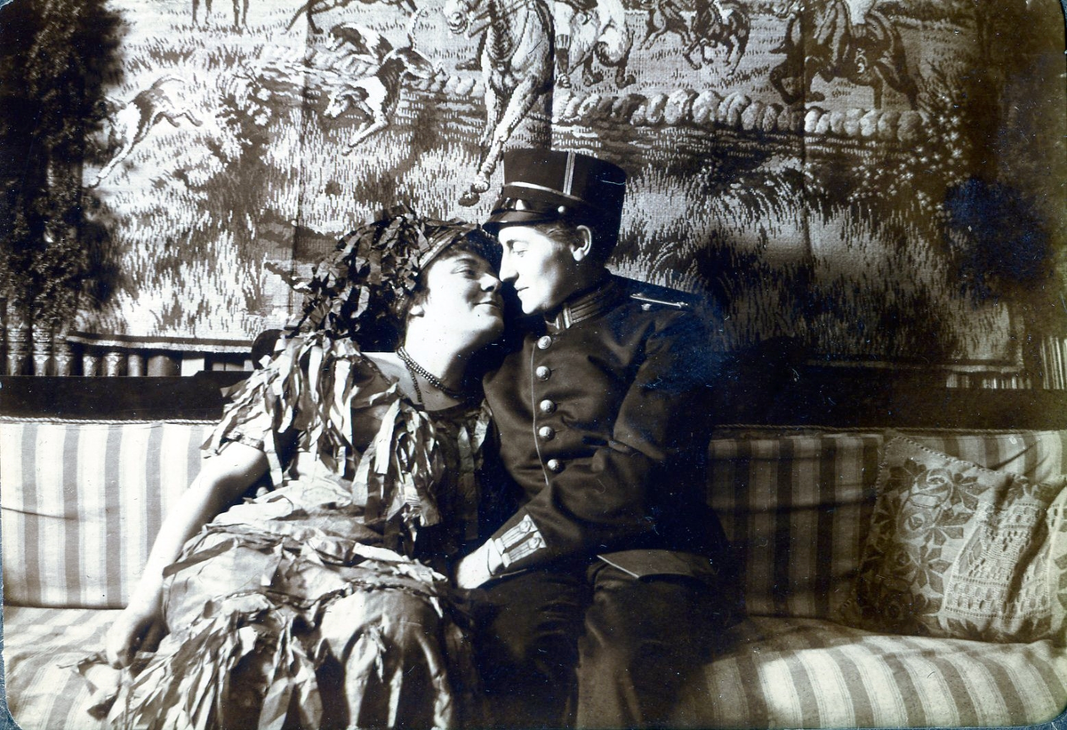 Titel: Oidentifierad underlöjtnant med dam i soffa. Kalmar regemente.