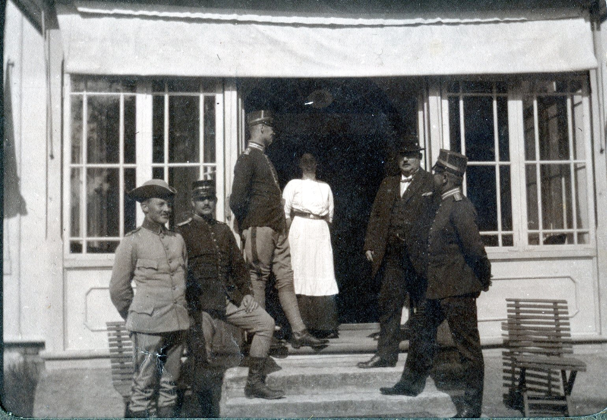 Titel: Oidentifierade officerare och två civilklädda personer framför veranda. Kalmar regemente.