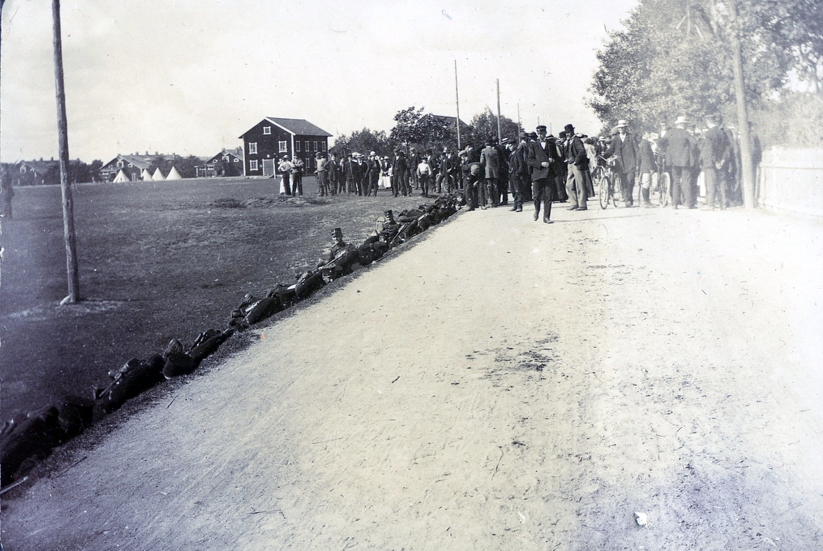 Trupp under rast, samt civilklädda människor. Hultsfreds slätt. Kalmar regemente.