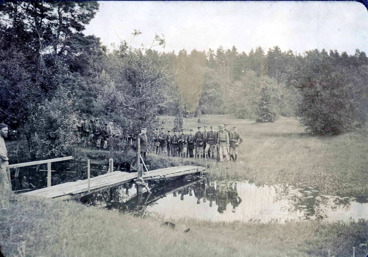 Titel: Hög officer på spång framför trupp. Kalmar regemente.
