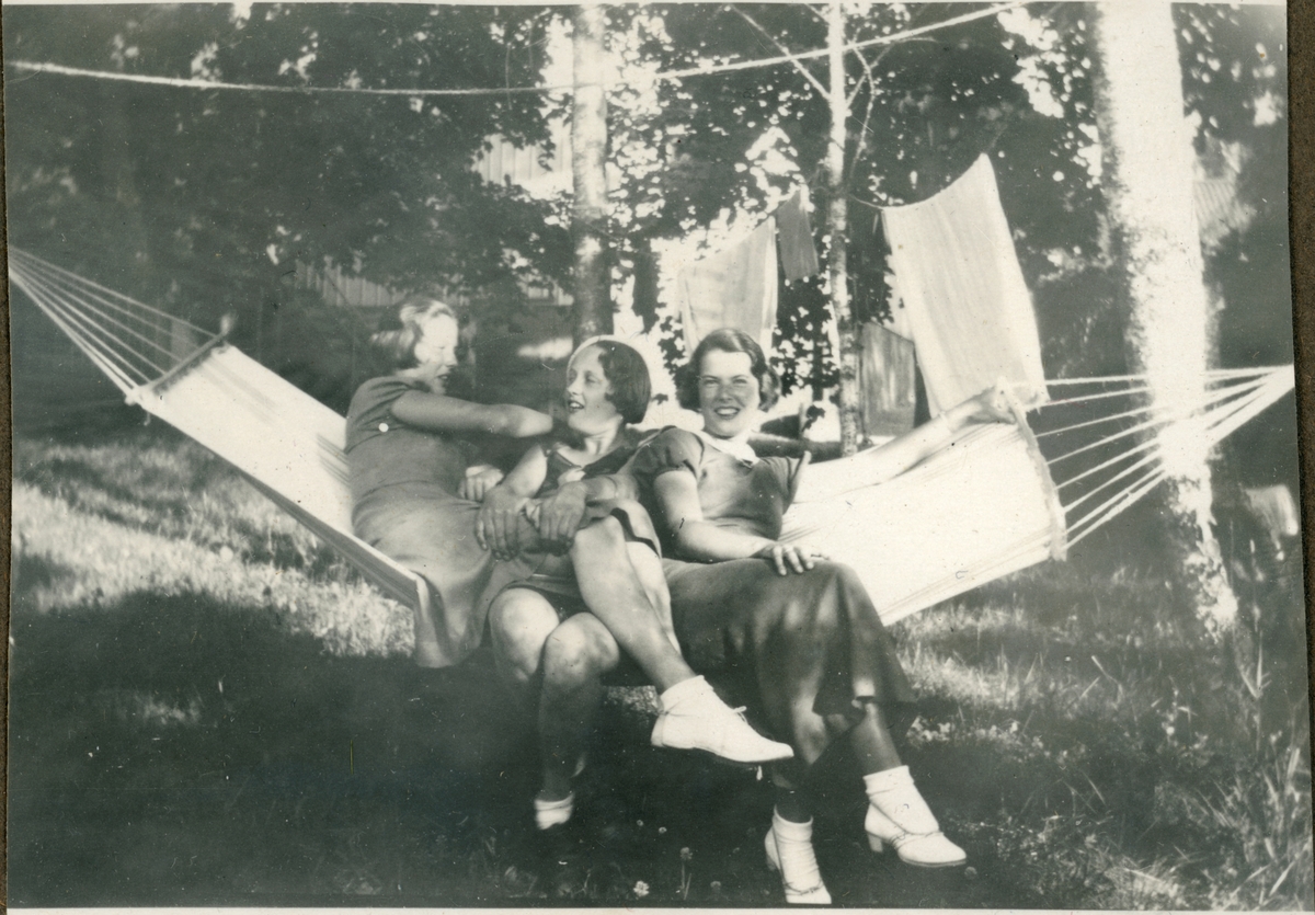 Tre unga kvinnor i hängmatta. Sannolikt elever vid Vänersborgs högre läroverk för kvinnlig ungdom