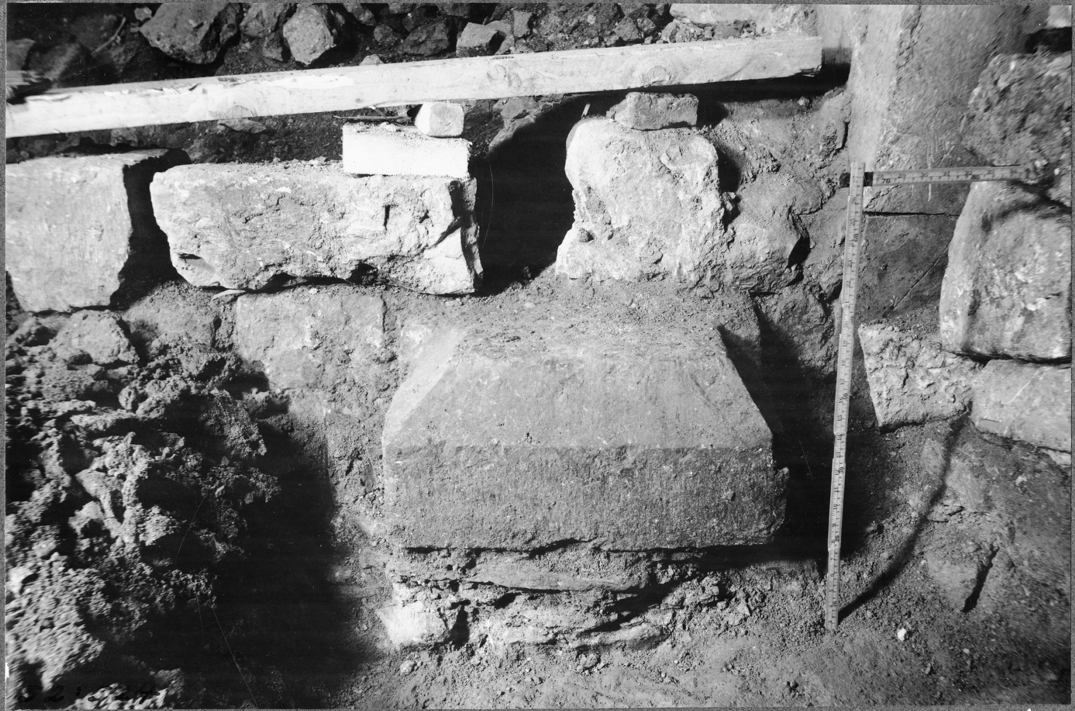 Grävning inom kyrkan, norra pilasterbasen in situ.