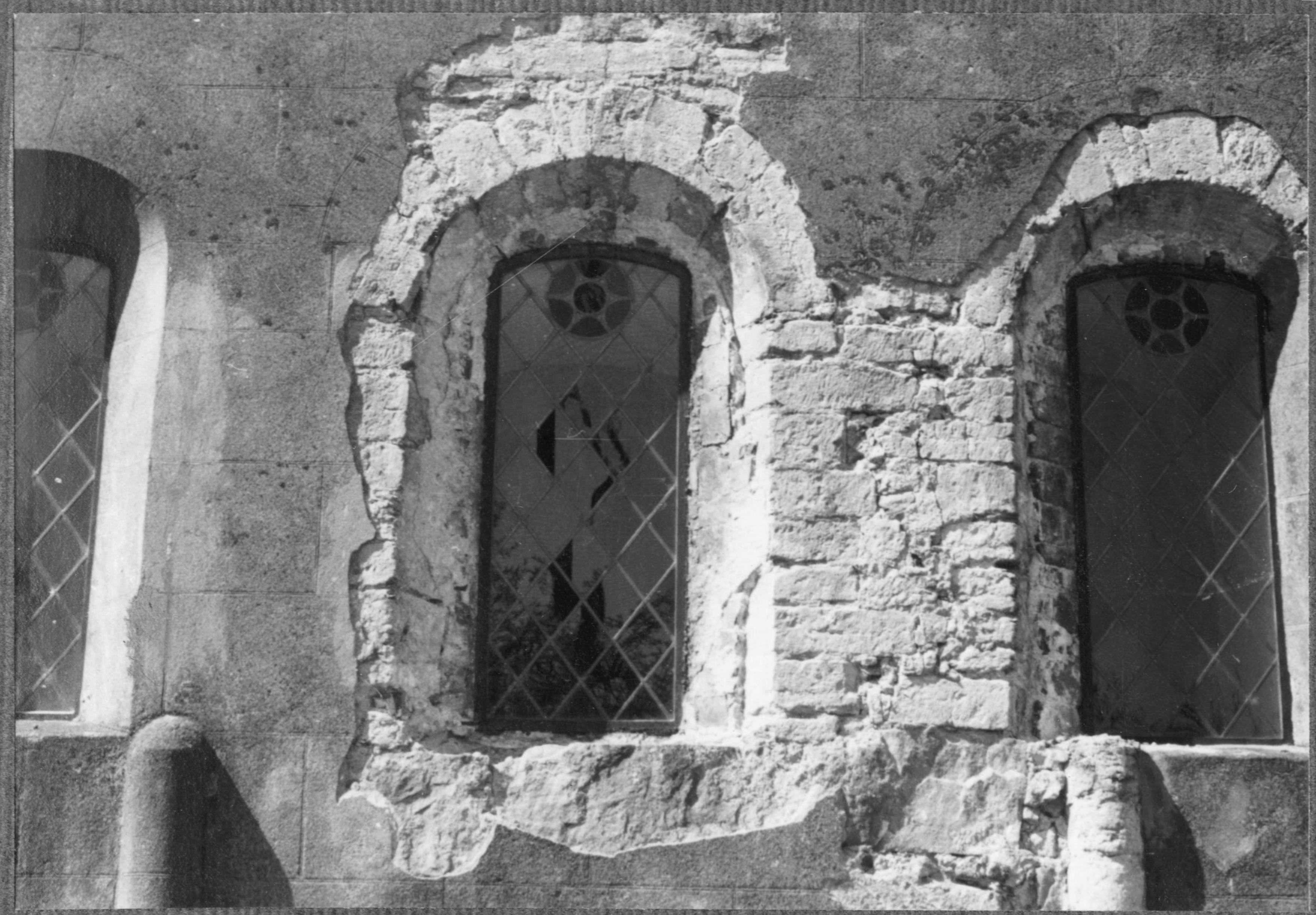 Kyrkan, fasad med fönstersmygarna delvis igensatta med tegelbreckor. Vid nedknackningen av puts.