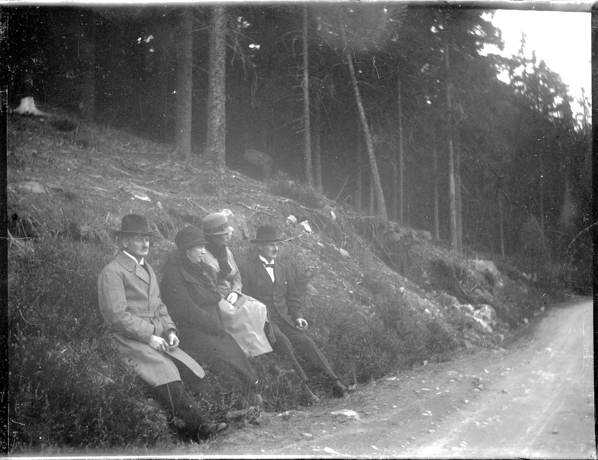 Vilopaus i en skogsdunge under promenaden. (Morbror Melker med.)