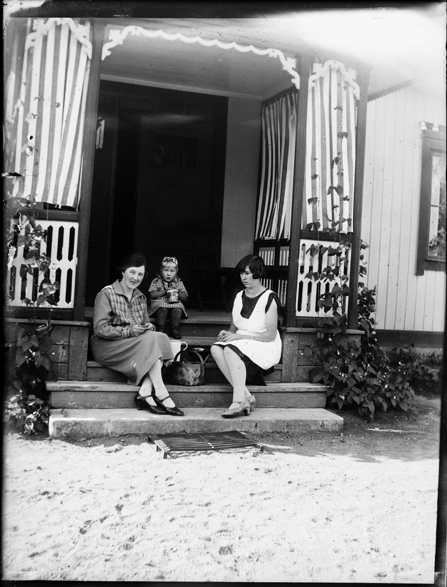 Dalarna. Fru Andrén med dotter och hembiträdet Märta Sandin på trappan till Klockaregården.