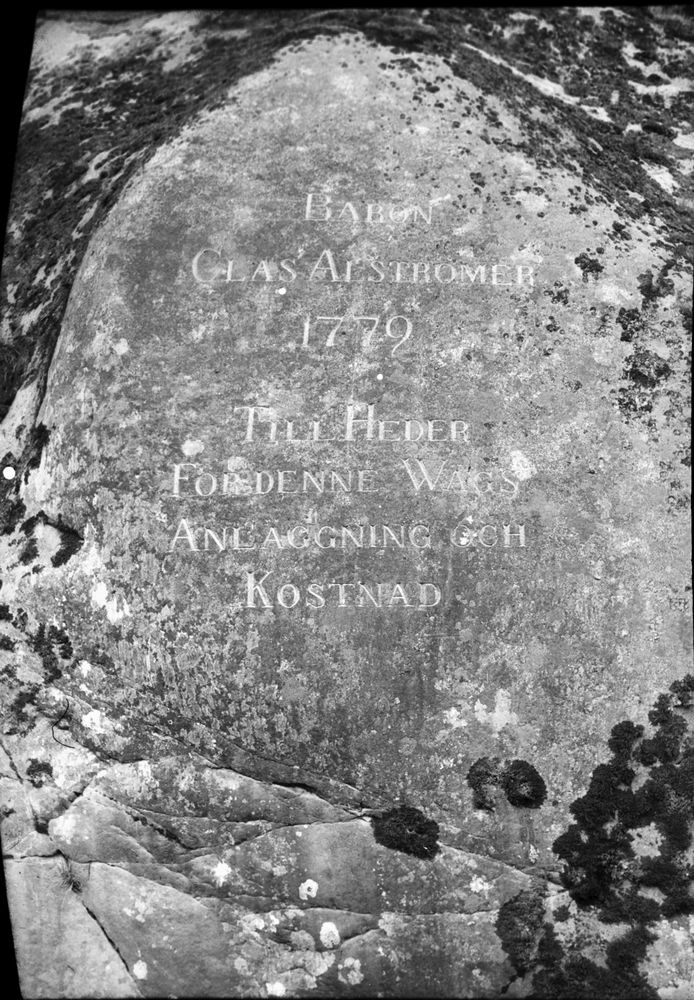 Inskription i bergväggen vid Jonsered till minne av Alströmmers väganläggning.