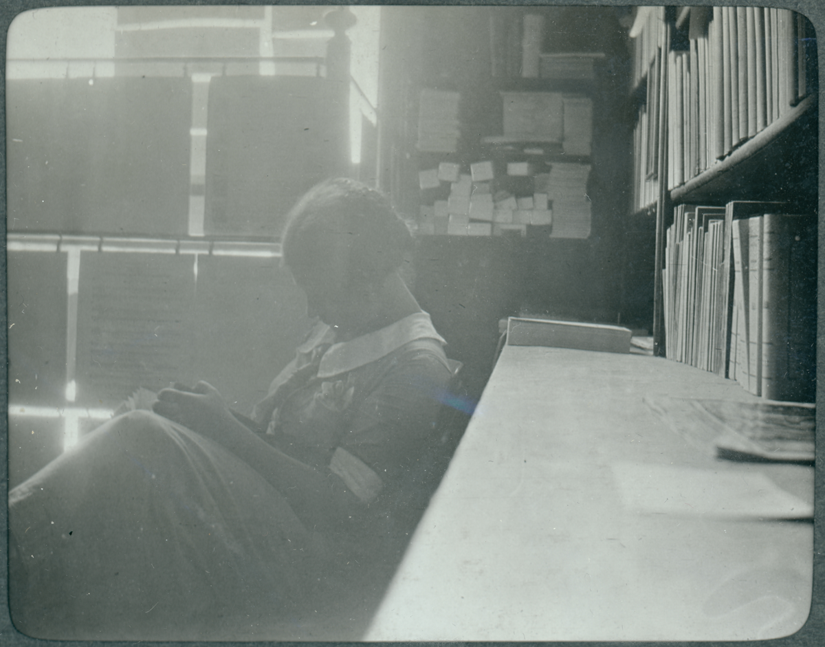 Kvinna som läser i en bok. Troligen i Georg Bergius bokhandel