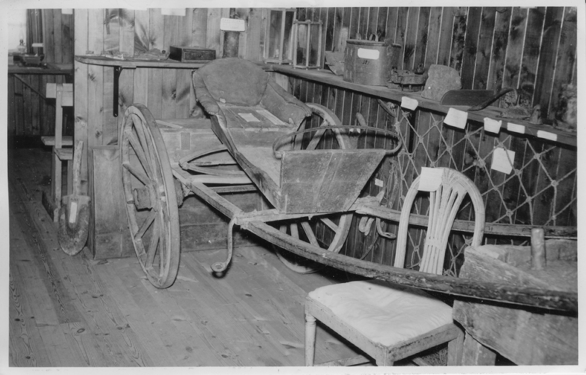 Nårungabygdens missionshistoriska museum. Interiör. Ljur. Karriol, färdig omkr. 1860 av Ljurskamjölnaren, Nårungabygdens väckelseman på 1800-talet. År 1868 skjutsades Peter Fjellstedt omkring i bygden på detta åkdon. Karriolen inropades på auktion 1879 efter Ljurskamjölnaren.