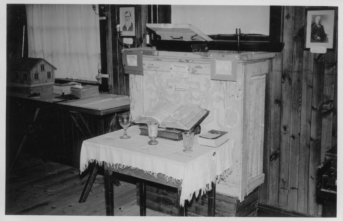 Nårungabygdens missionshistoriska museum. Inte0riör. Ljur. Ljurskamjölnarens prediksol. Han var Nårungabygdens väckelseman på 1800-talet. På bordet ligger hans bibel som han förde med sig på sina prediksresor.
