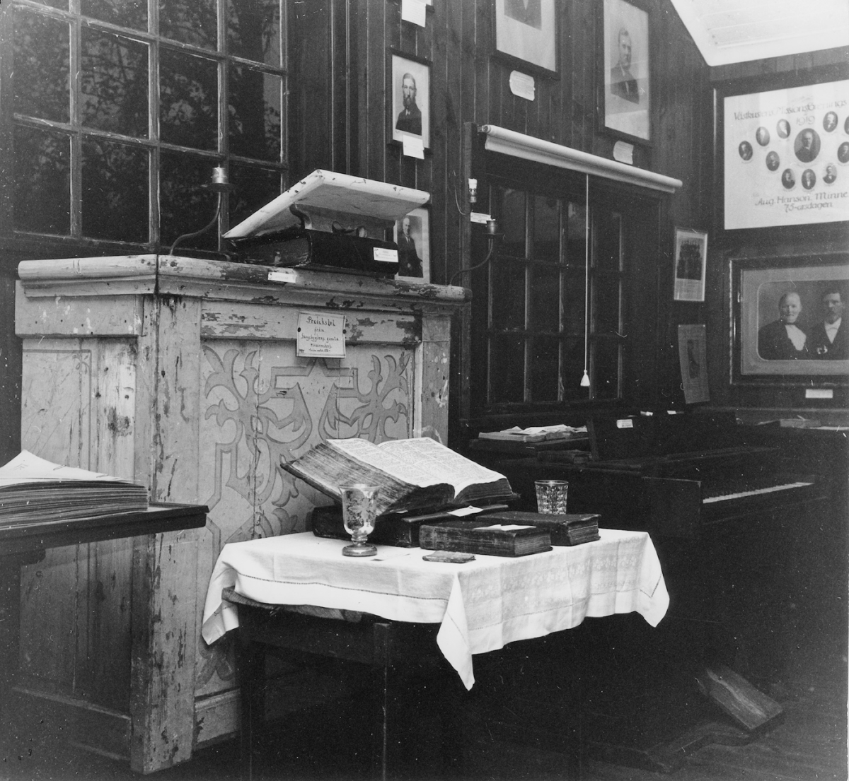 Nårungabygdens missionshistoriska museum. Interiör. Ljur. Ljurskamjölnarens prediksol. Han var Nårungabygdens väckelseman på 1800-talet. På bordet ligger hans bibel som han förde med sig på sina prediksresor.