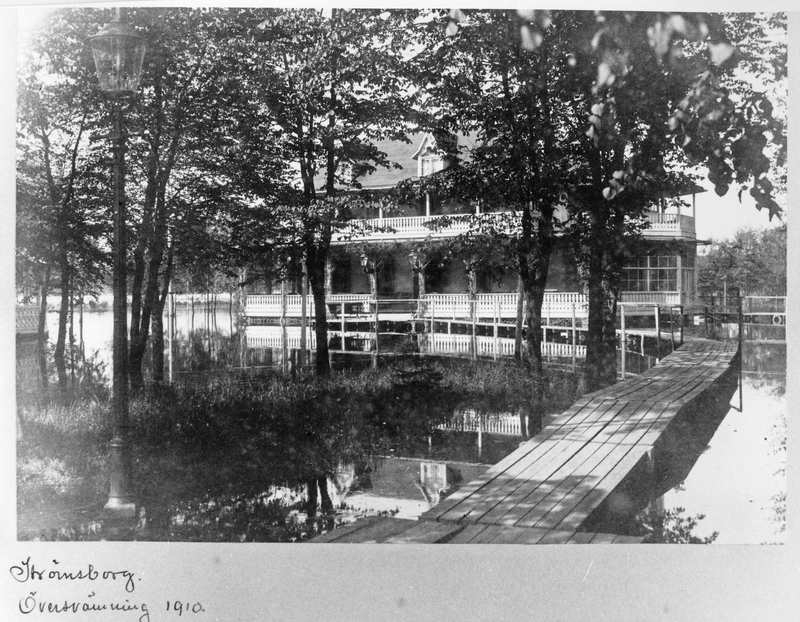 Strömsborg står i vatten. Högt vattenstånd i Vänersborg 1910.
