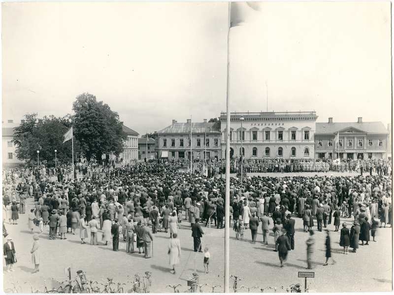 Uppställning på torget i Vänersborg inför öppnandet av jubileumsutställningen 21 juni 1944.