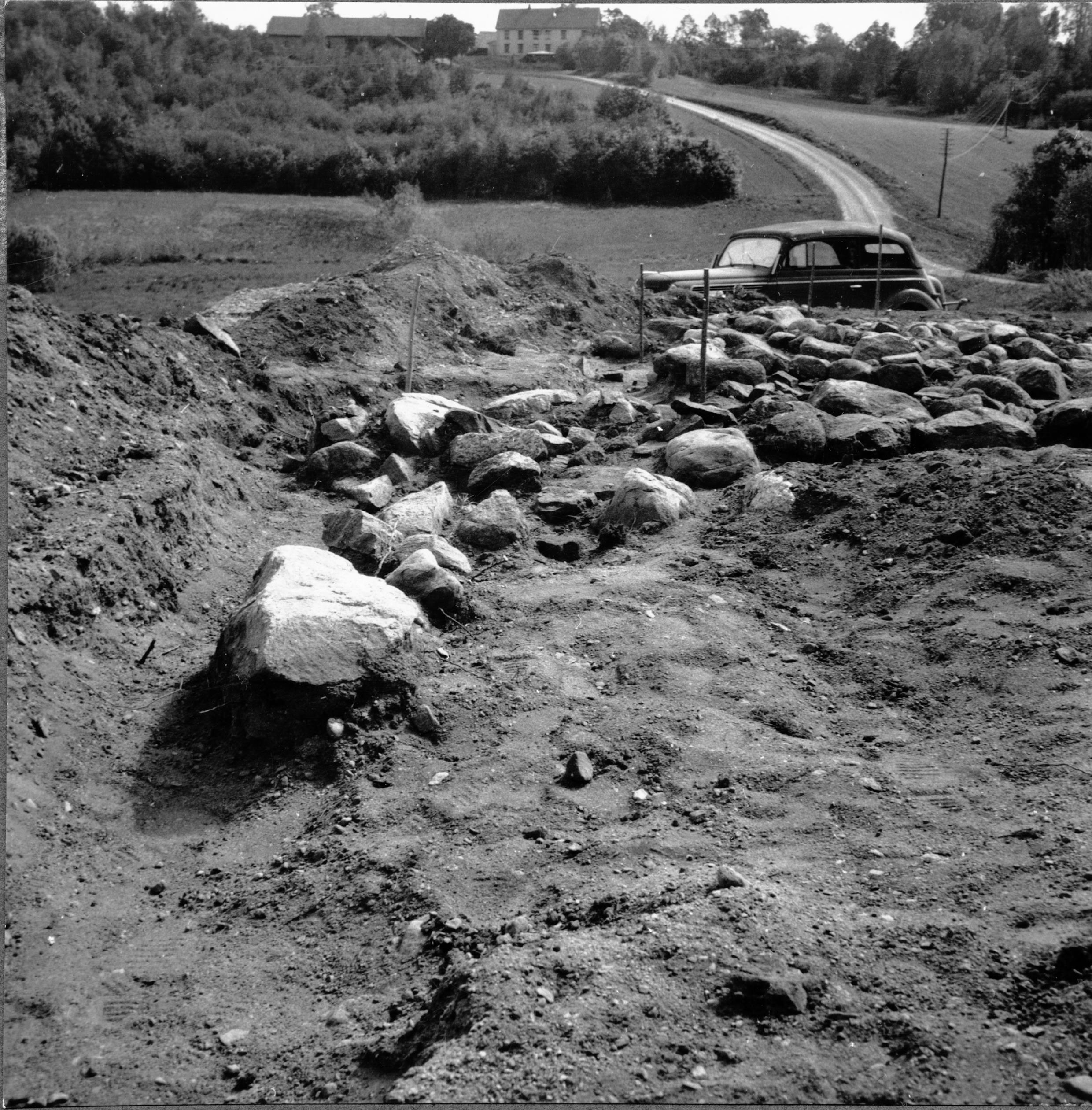 Kyrkans grundmurar under utgrävning. Nordmuren från väster.