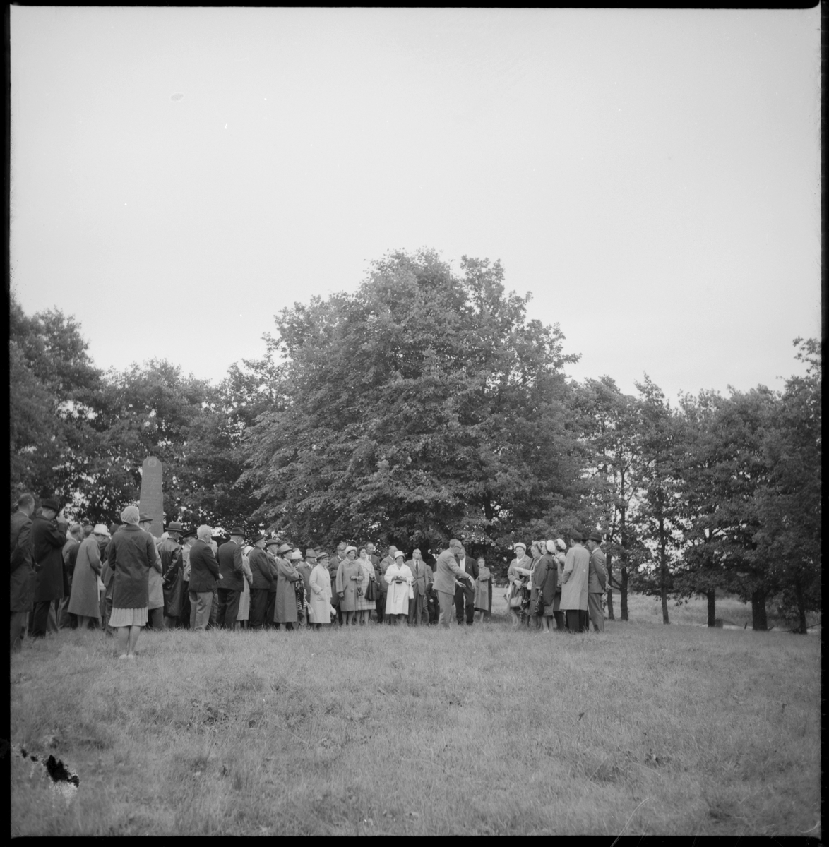 Titel: Gestads kyrka. Minnesceremoni vid Friherre Axel Erik Roos (1684-1765) gravmonument. År 1919 restes två minnesstenar, den ene till minne av den gamla kyrkan och kyrkogården, den andre till minne av friherre Axel Erik Roos.
