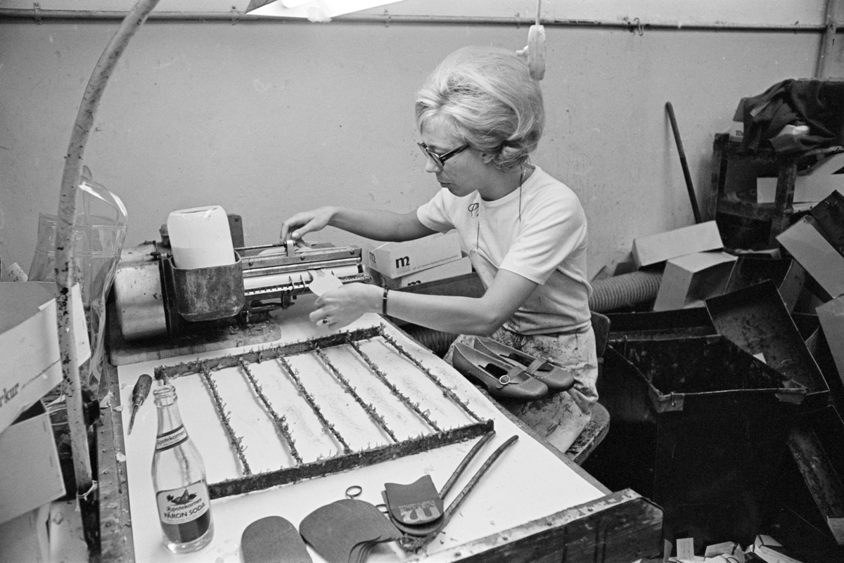 Klistring av inläggssula. Text från inventering " På bilden är det Ninell Söderlund som i klistringsmaskinen bestryker inläggssulor med klister. Dessa läggs sedan att i viss mån torka på det galler hon har framför sig innan de läggs på plats i skon".