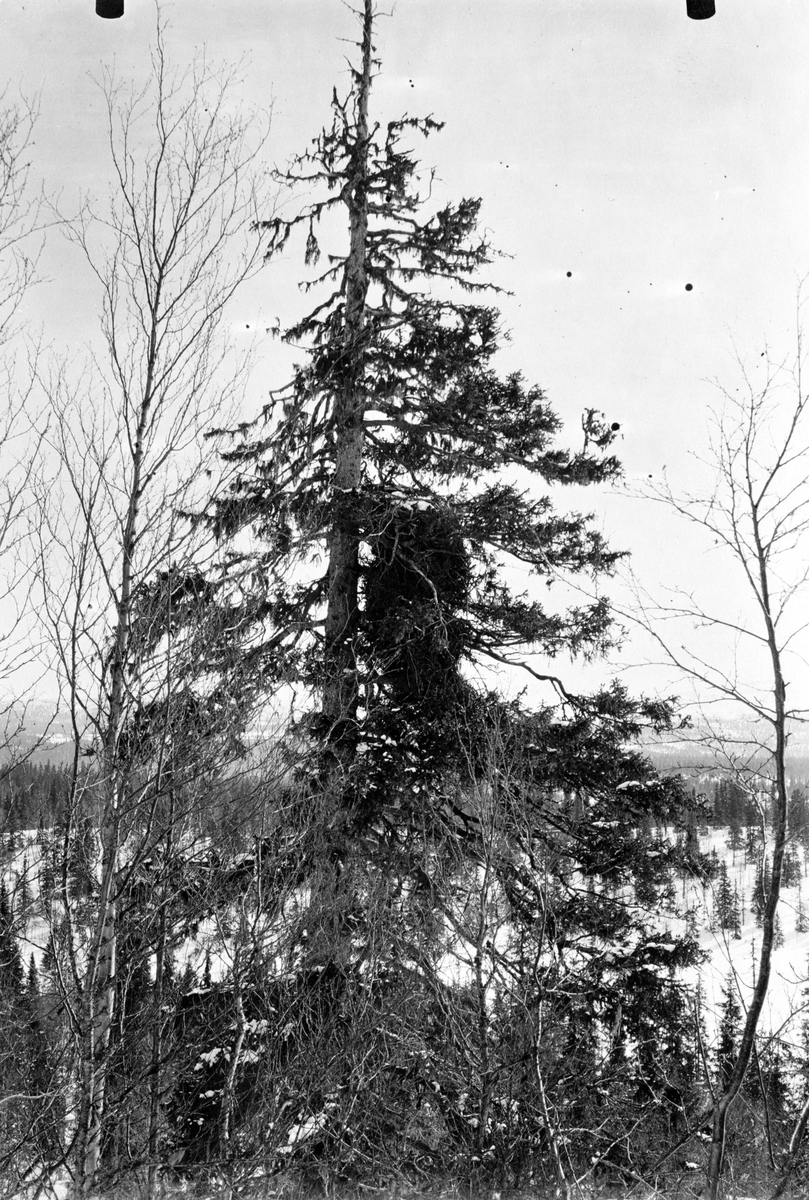 Toppen af gammal gran, i hvilken ett kungsörnsbo, Aquila chrysaetos, befinner sig. Boet ca 3 m högt, uppfördt af en något oregelbundet cylindrisk rismatta af mestadels ganska fina, 1-2 cm tjocka grenar af gran och björk. Riscylinderns största diameter upptill är 1.3 m Foto E. Wibeck d 1 april 1921