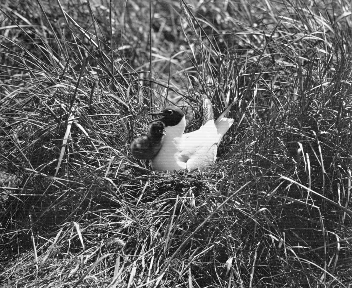 Skrattmås (Larus Rdibúndus) med ett ägg i boet och en unge vid sidan.