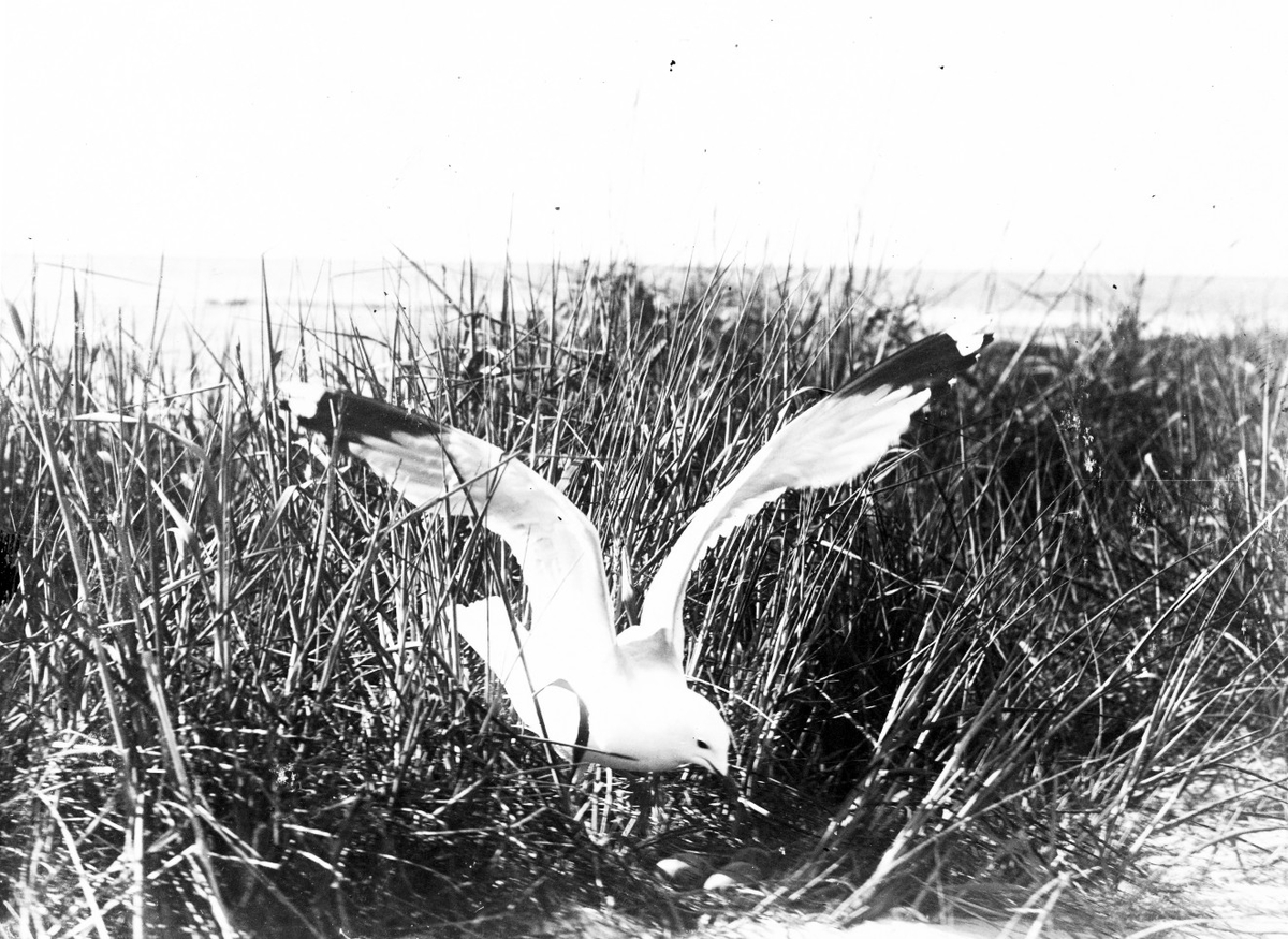 fiskmås, Larus Canus, slår sig ner vid boet. 10 Juni 1917