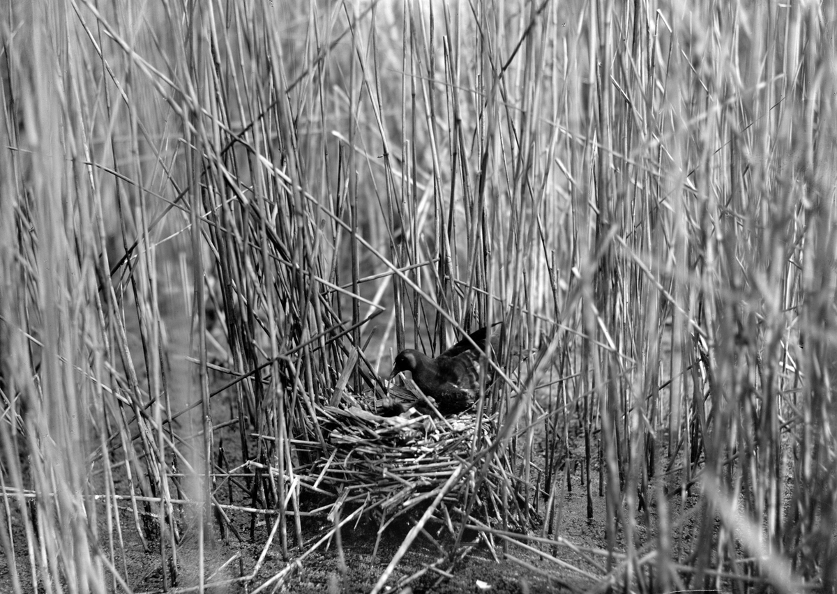 Rörhöna (Gallinula c. chlóropus) vid bo med ungar. 18 maj 1914.