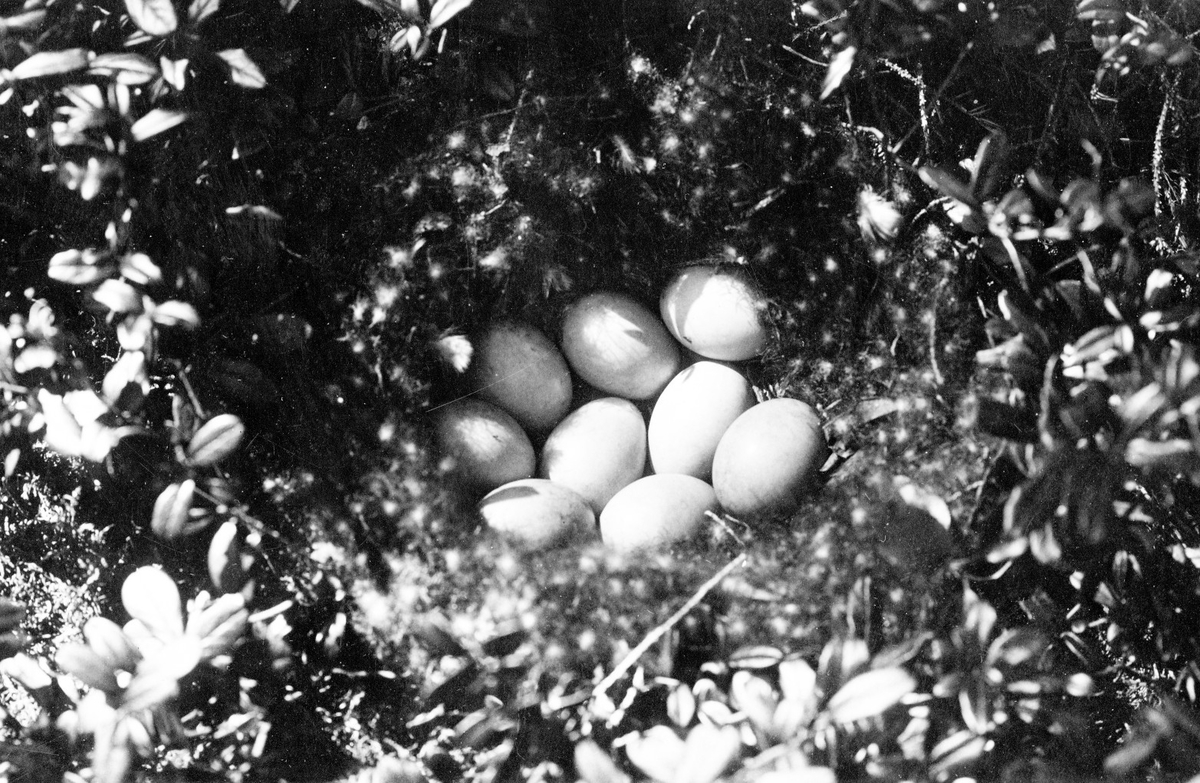 Bo av Krickand (Anas crecca) 8Juni 1926. Boplatsen bland lingonris.
