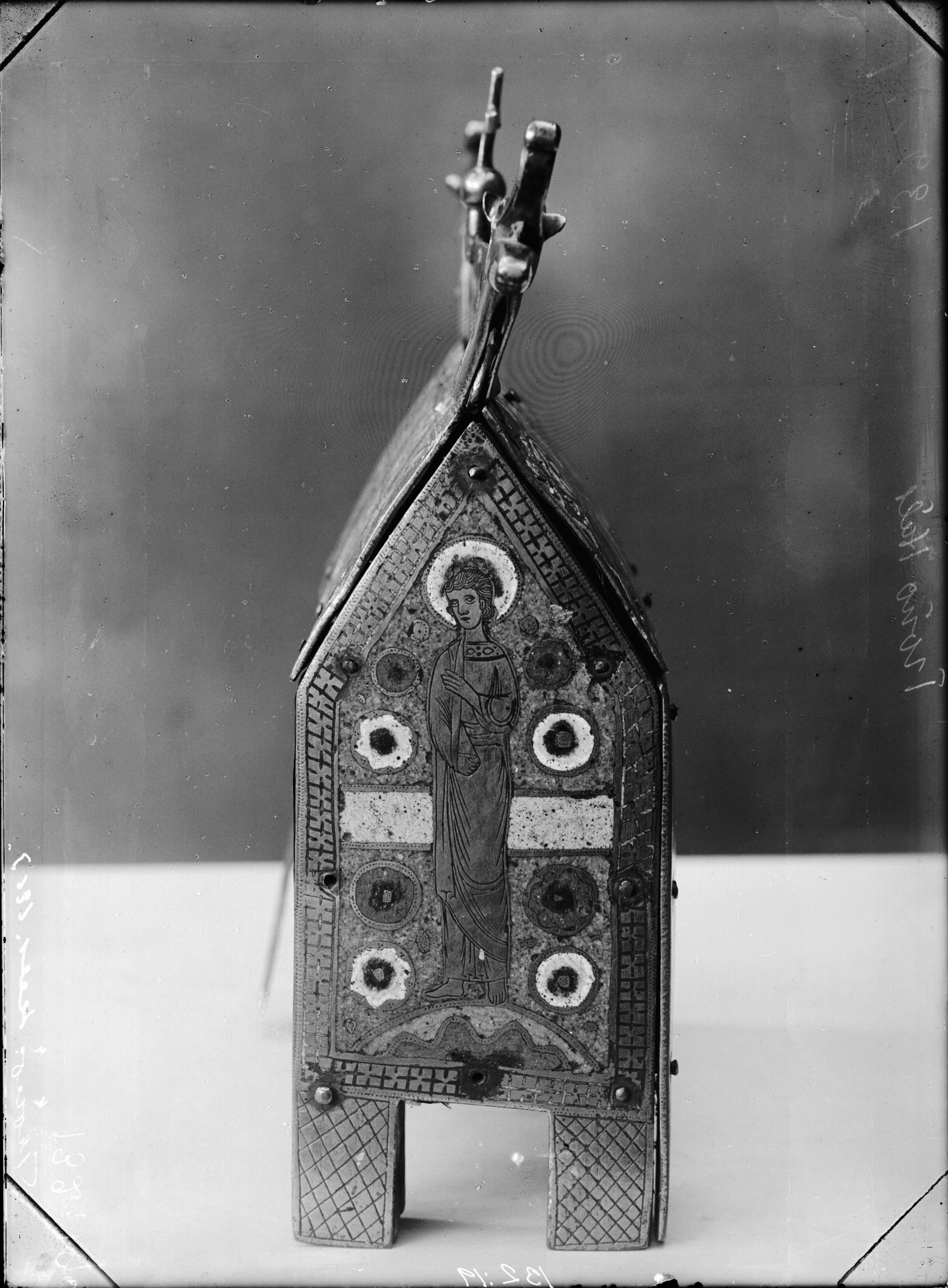 Relikskrin, på kortsidan manlig bild med bok.Troligen från 1100-talet slut.