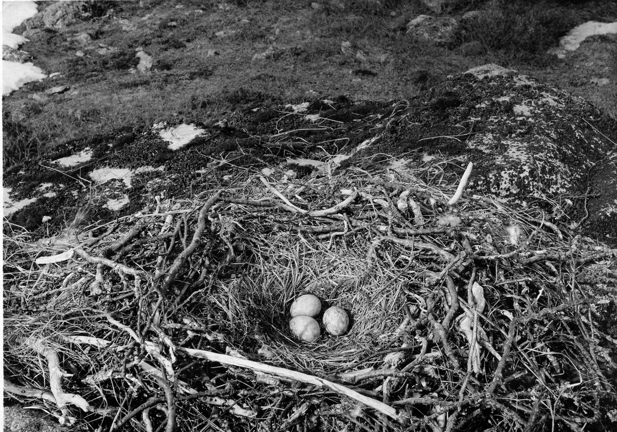 Bo av fjällvråk,byggt uppe på ett stort flyttblock vid stranden av Vuotsijaure i övre delen av Pessinenjokks dalgång. Foto E.Wibeck 24/6 1927