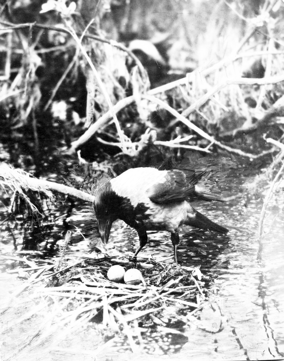 Kråka plundrande doppingbo. Tillhör kråkfålar bland tättingarna.