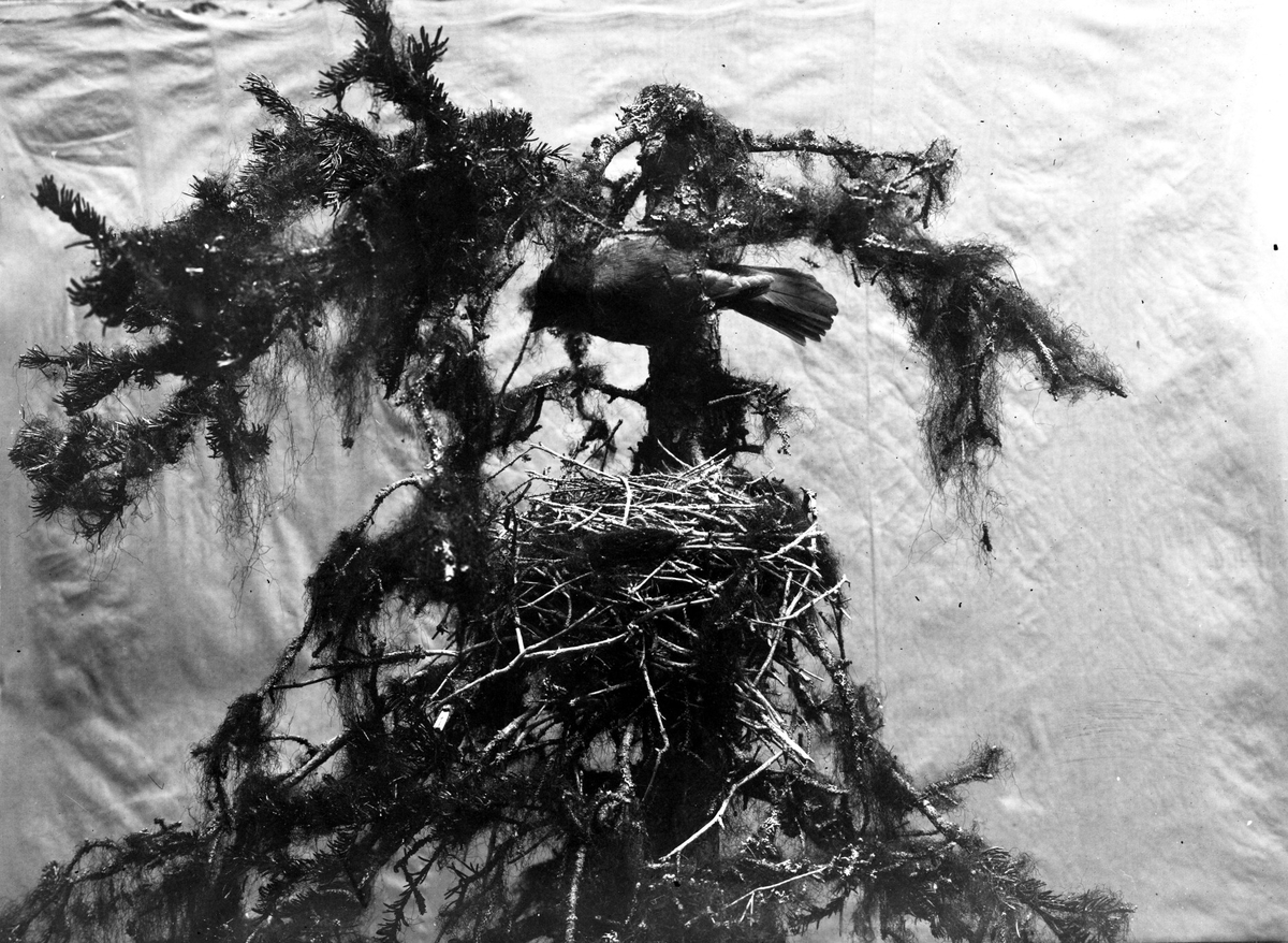 Fågelbo, Lavskrika, Perisoreus Infanstus. Foto å Malmö museum av bo, nedfört av P.R-S