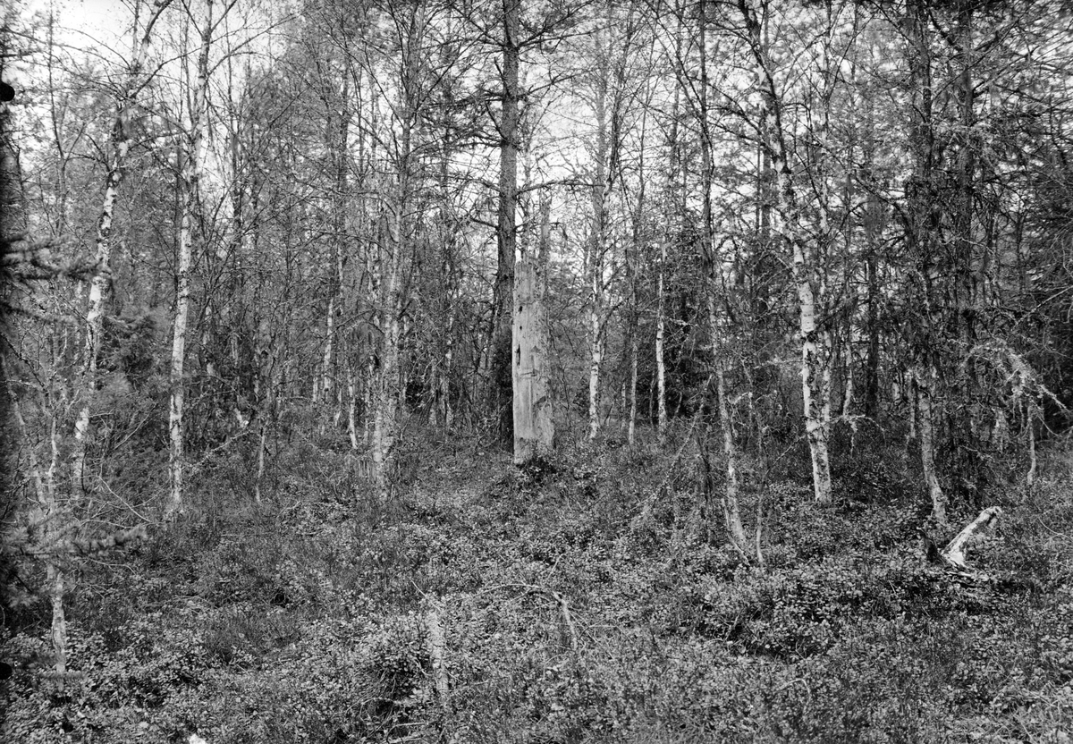 Boplats för Tofsmes, Parus cristatus, 10 Maj 1913. Stubbe mitt i bilden.