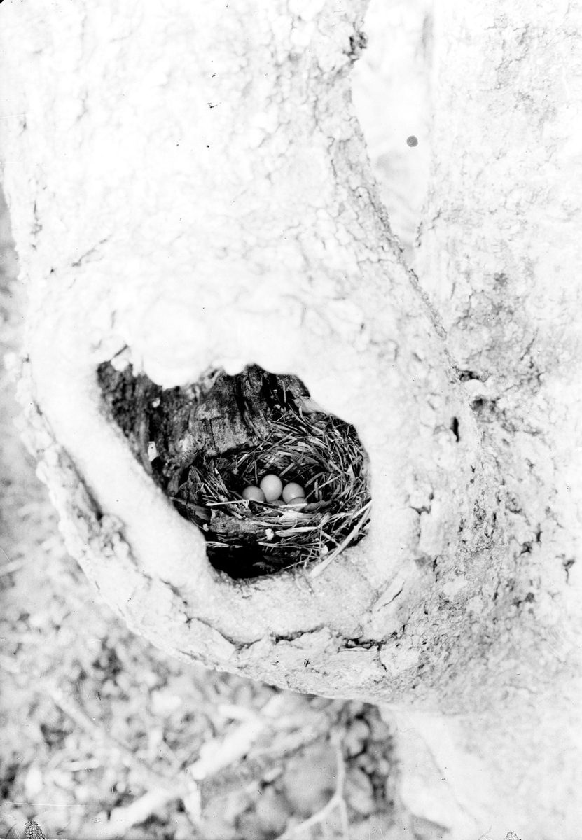 Bo i ihåligt träd av Muscicapa collaris, halsbandsflugsnappare.
