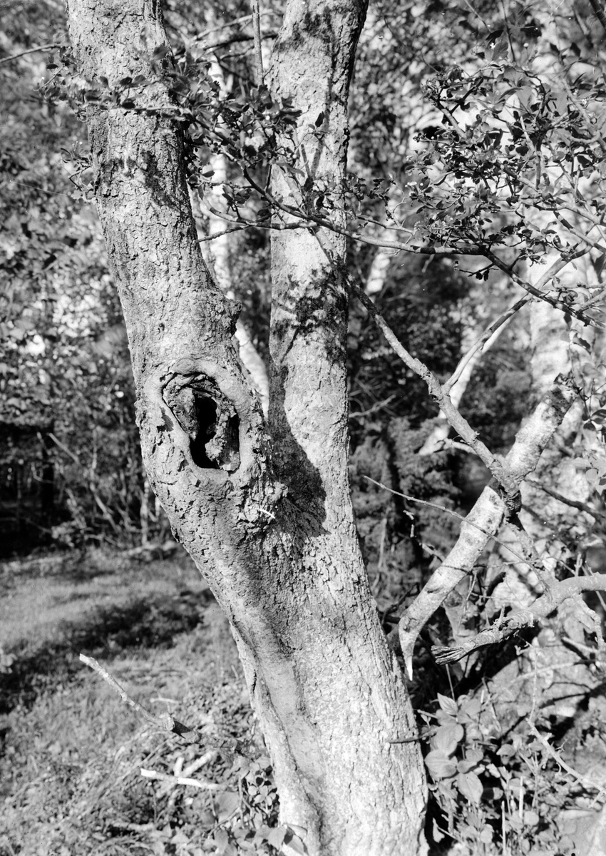 Boplats för Muscicapa collaris, halsbandsflugsnappare. Hålet i grenen!