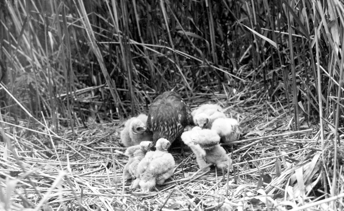 Ungar av blå Kärrhök (Circus cyaneus) med hona. 1923