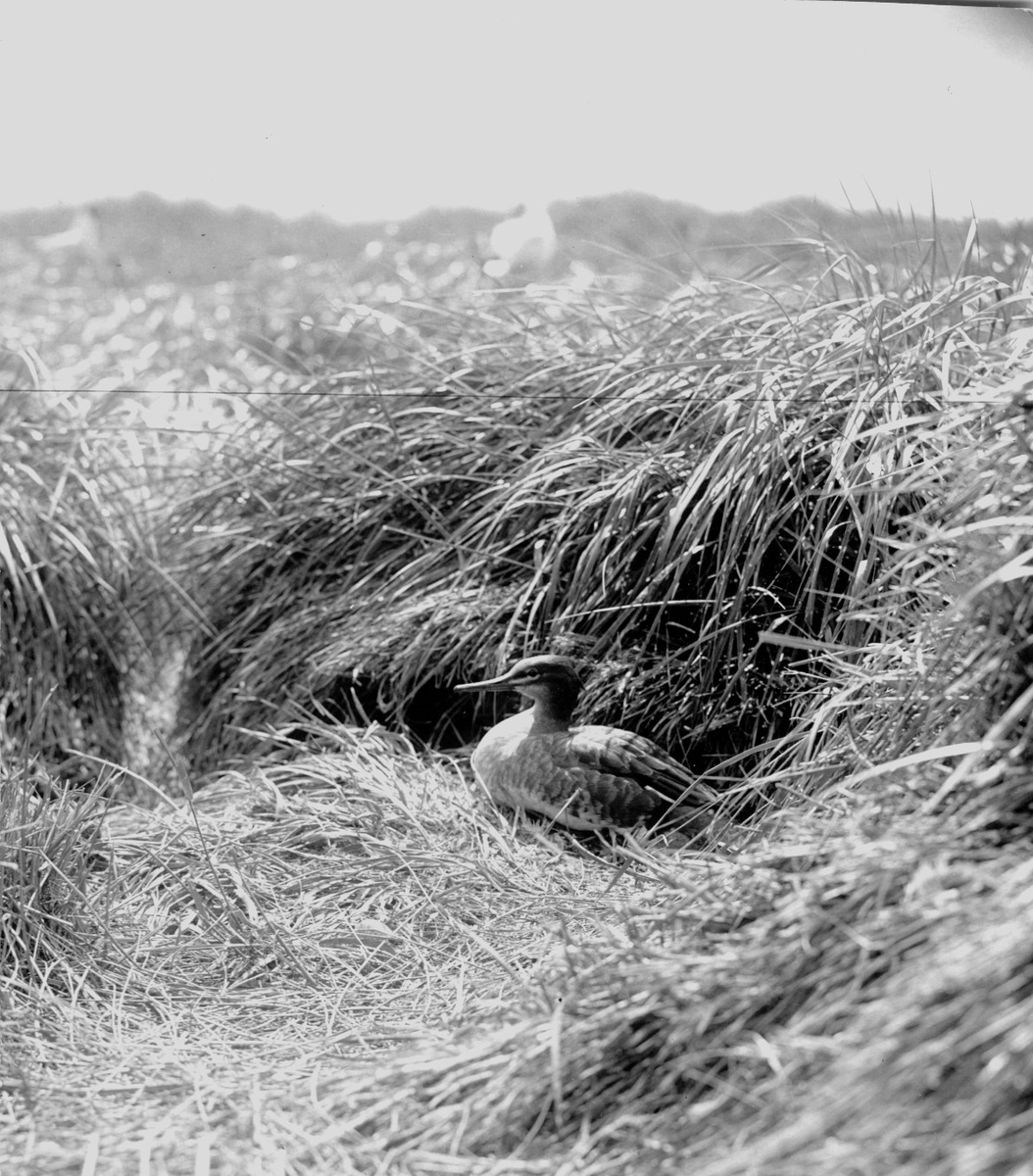 Småskrak (Mergus serrátor) liggande strax utanför boet