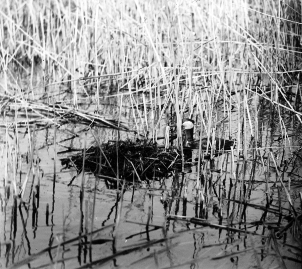 Podficeps rubricollis, rödhalsad dopping, på väg till boet. Torup, Bara, Skåne