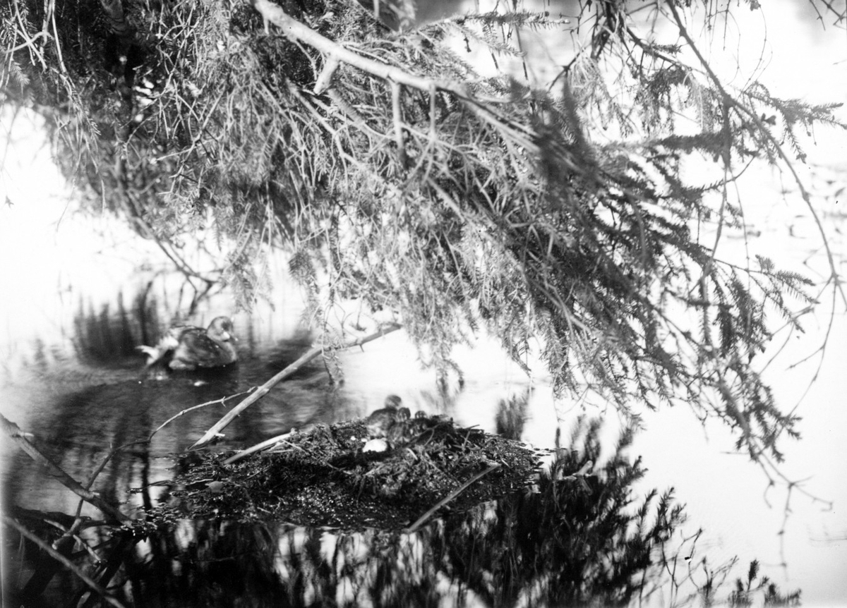 Podiceps minor, smådopping nära boet med ungar. Karnavävaresjön