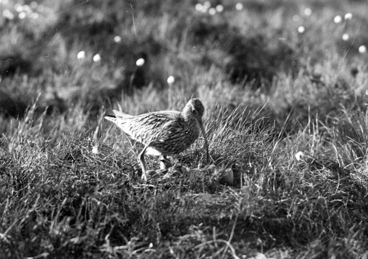 Storspov, Numenius arquata. Storspoven står över äggen, Vissmossen, Satserup, Skåne