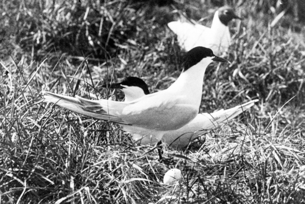 Ett par kentska tärnor, Sterna cantiaca, och en skrattmås
