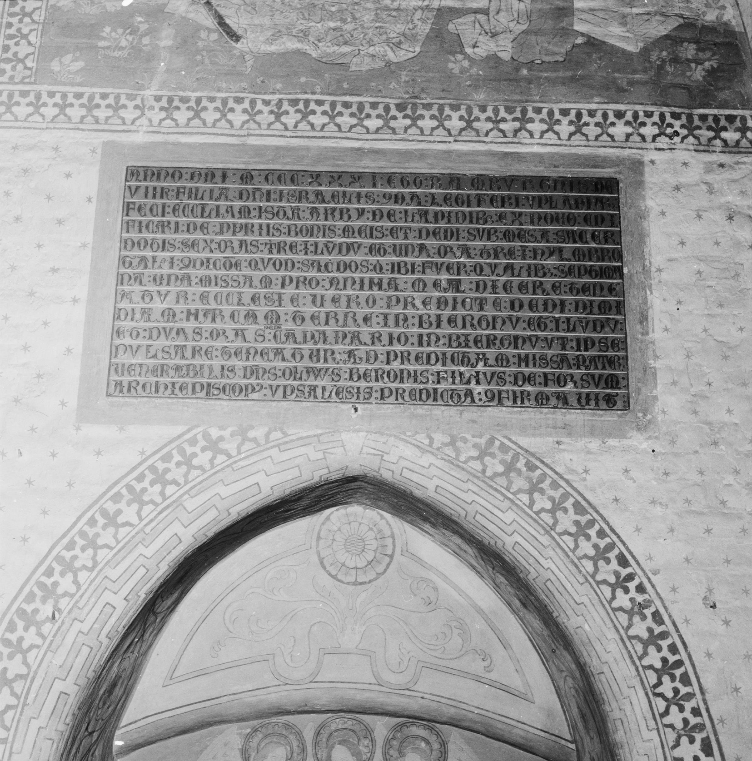 Stenplatta med inskrift, donationsurkund, koret mot norr.
