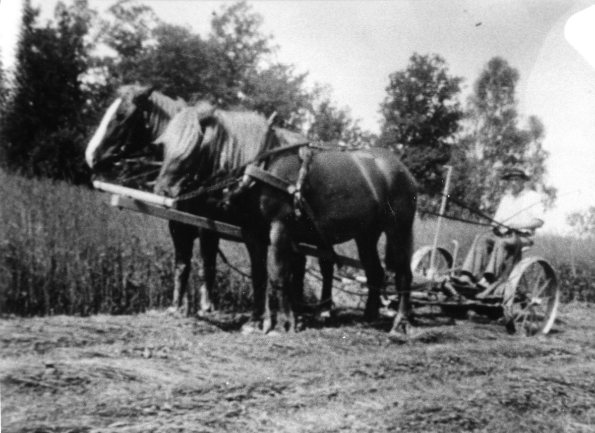Tvärred, Tvärredslund. Bertil Norström med parhästar för slåttermaskin