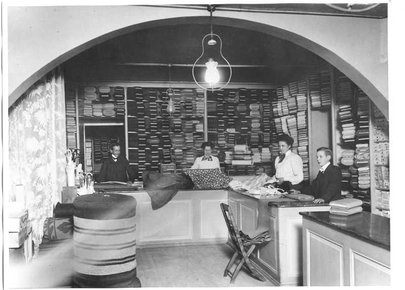 Vänersborg. Interiör från firma Henric Hegardts. Från vänster Emil Johansson, Clara Thunberg, Stina Jönsson, Sven Fock.