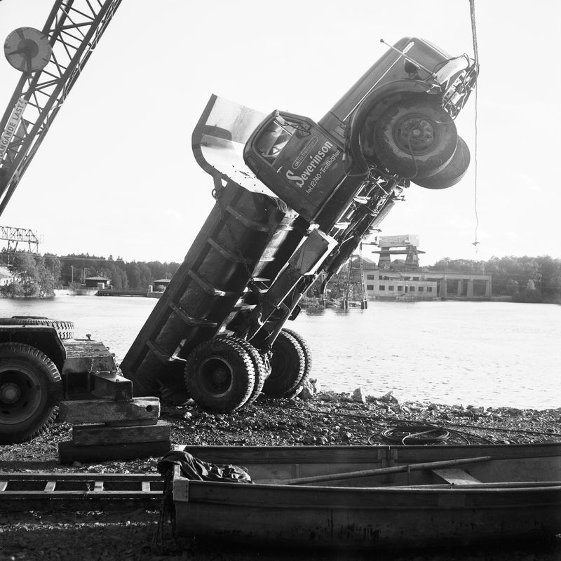 Titel: Wargöns AB. Byggnation av PM 5 1959-60. Foto och påförd text av dåvarande ritkontorschefen Ragnar Söderberg. Ett missöde vid stenpiren som slutade bra denna gång, endast bilen hamnade i vattnet. Sakta men säkert lyftes bilen upp från sitt ofrivilliga dopp i Göta älv den 18/6 1959.