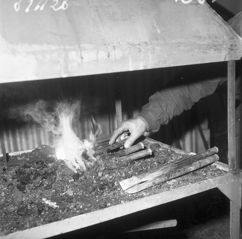 Den dagliga rutinen för en anläggningssmed: Att glödga mejslar och med säker hand vässa dessa till goda huggverktyg.