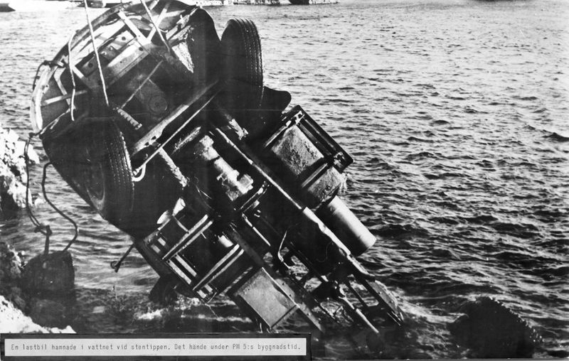En lastbil hamnade i vattnet vid stentippen. Detta hände under PM 5:s byggnadstid.