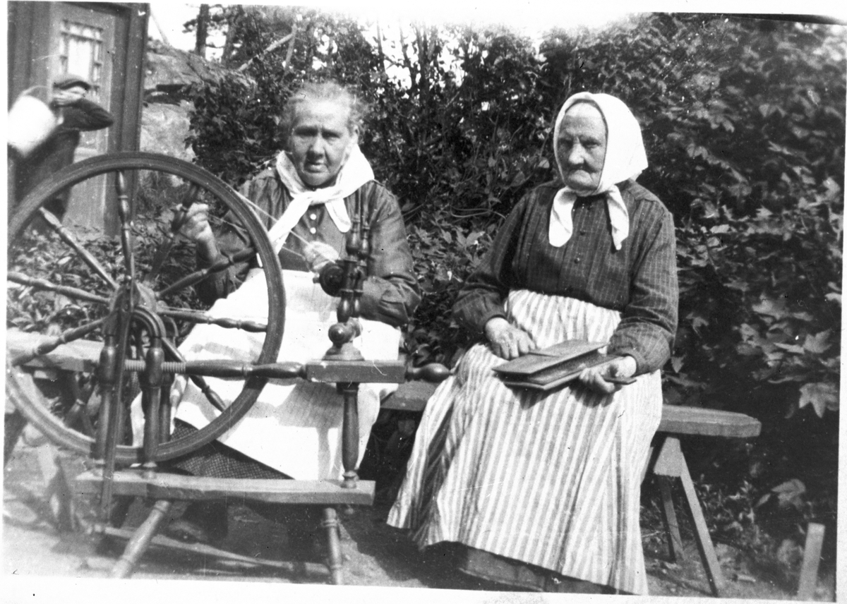Två damer vid en spinnrock.